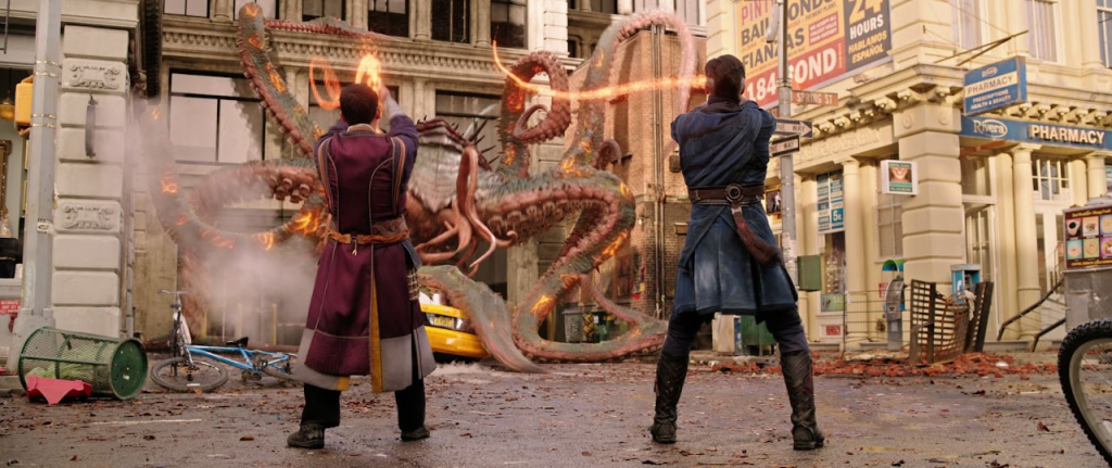 Strange wakes up and summons a magic axe to chop off a tentacle to save Wong. Wow, Strange is bringing up a lot of useful spells in this movie! Wonder if he’ll use them more than once! The two then try to attach magic chains to the monster in hopes of…my fucking God, are you kidding me with this shit?