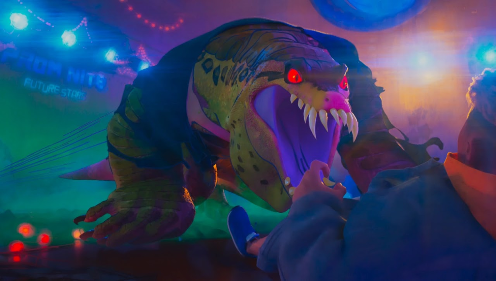 As we’re properly introduced to Gwen’s universe (rendered in gorgeous pastel brushstrokes), we learn that she’s still thinking about Miles, her first real friend since her world’s Peter Parker, who we know from the last movie was someone she couldn’t save. Flashing back, we see the story in full. Like most iterations of the character, Peter was a nerd who was bullied in school. Only instead of keeping his good heart and eventually becoming a superhero, he developed an inferiority complex that lead him to concoct a serum that turned him into The Lizard. While Gwen waited for him at their school dance, the creature burst in and mindlessly rampaged, forcing Gwen to don her suit and take out the Lizard…only to realize too late that the Lizard was her best friend who, in his dying breath, tells Gwen he just wanted to be special like her. The design of the Lizard is different from the brief glimpse we saw of him in the first movie, more akin to a komodo dragon here than the humanoid figure we saw in the previous film. Though this is technically a retcon, it adds to the tragedy of the scene because it’s made clear that Gwen had no possible way of knowing the rampaging monster was her best friend.