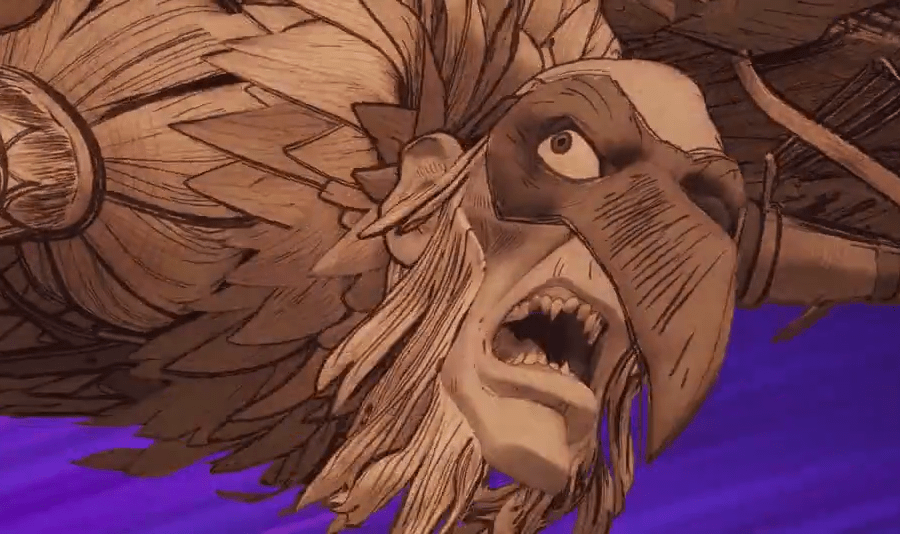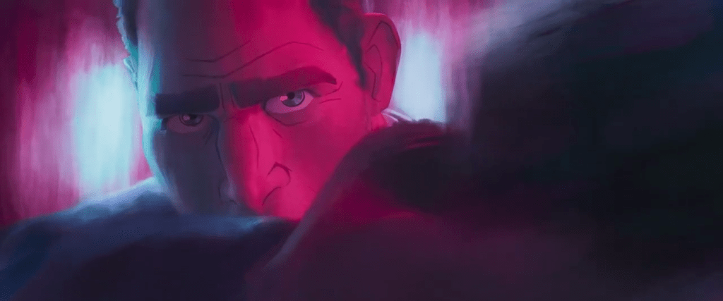 Continuing this film series’ bizarre talent for combining different art styles seamlessly, this take on Vulture is a moving da Vinci-style linework/schematic on yellowed paper who interacts with Gwen’s world perfectly. Gwen sees Vulture glitching and correctly assumes he’s from a Renaissance-era dimension who’s been displaced into her’s somehow (Vulture snarls in an Italian accent, “Yes, that’s pretty much it!”)