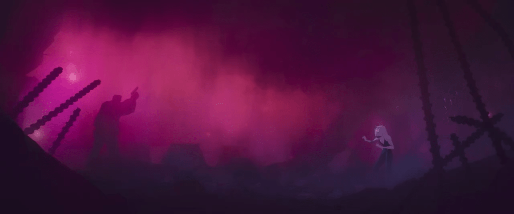 Gwen stealthily enters her house and finds her dad passed out on the couch. He’s gotten skinnier and he’s grown a five o’clock shadow since we last saw him. Even with Gwen’s mask on, we can tell she’s feeling a mixture of concern, hurt, resentment…and relief. But just as she’s about to leave again, her dad wakes up and catches her. The reunion is…icy. Gwen makes a sarcastic comment about how she’s been out murdering her friends, and then it’s her dad who turns to leave. Gwen catches up to him and gets to a point where she can pour out the inner conflict she’s been holding in the whole movie. Hailee Steinfeld gives a stunningly convincing and human performance, conveying the raw emotion of a girl who’s tried so hard and yet has lost so much, and it’s only matched by the animation of her character and the soft shift of the environmental colors