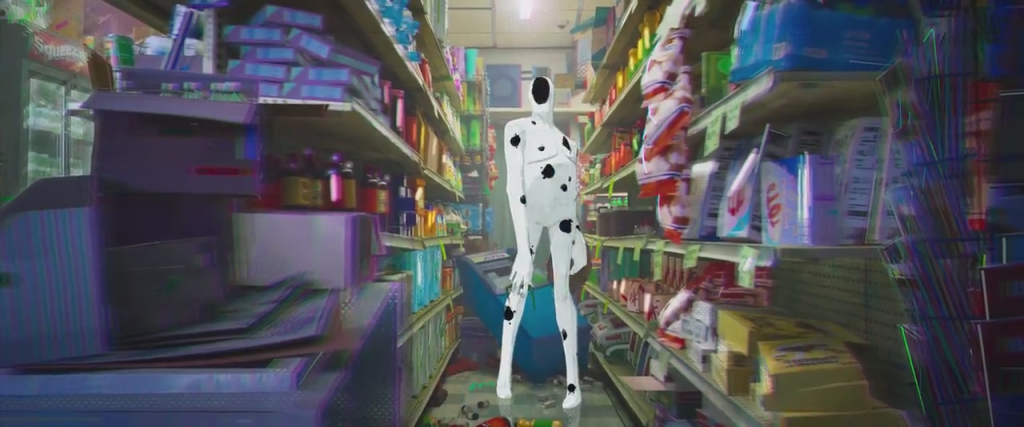 Miles just laughs at his name and bizarre appearance before this new foe says he’s from Miles’ past and that he is “his nemesis.” Miles is barely listening though, since he’s receiving texts from both his parents asking where the hell he’s at. Deciding to wrap this up quickly, Miles starts tangling with his, uh, “nemesis.” But this proves easier said than done. The unpredictable nature of the Spot’s portals make him even harder to deal with, and Miles has to text and fight (something the Spot is none too happy with). Something really cool about the Spot’s design in this movie that’s hard to pick up without freezing the frames is that he’s created to look like an incomplete sketch. You can actually spot (heh) some construction lines around his humanoid figure.