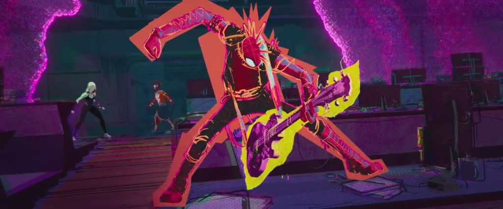 Miles is at it for quite a bit, the others unsure if it’s even working, before a fourth Spider-Man arrives. He’s carrying an electric guitar and is rendered like a newspaper clipping that changes shape and color between frames. He charges at the barrier…and busts it right open!