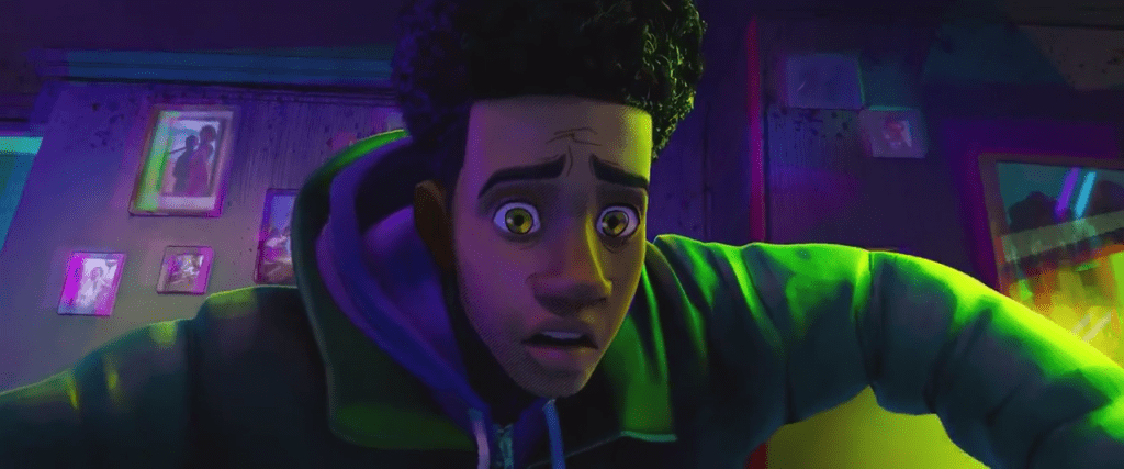 Back on Earth-42, Miles wakes up tied to a punching bag in Aaron’s apartment (much like he did to Peter B in the first movie). Miles vainly tries to tell Aaron there’s been a mistake and that he’s not from here. Aaron remains quiet and indifferent to his misplaced nephew’s pleading and simply plays some music while he places the Prowler glove on his hand. I never thought a man calmly turning up the volume on a record player could be so intimidating. Miles continues pleading with Aaron, telling him he doesn’t have to be the Prowler; he can be good. Whereupon Aaron just chuckles, punches the shit out of the bag with the Prowler glove, and tells Miles shortly that he isn’t the Prowler.