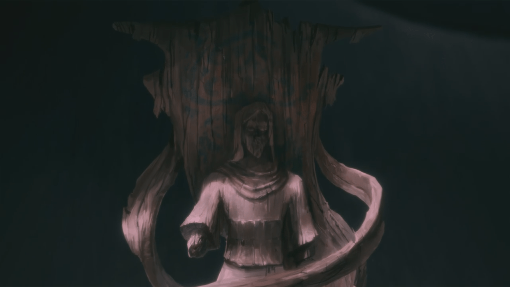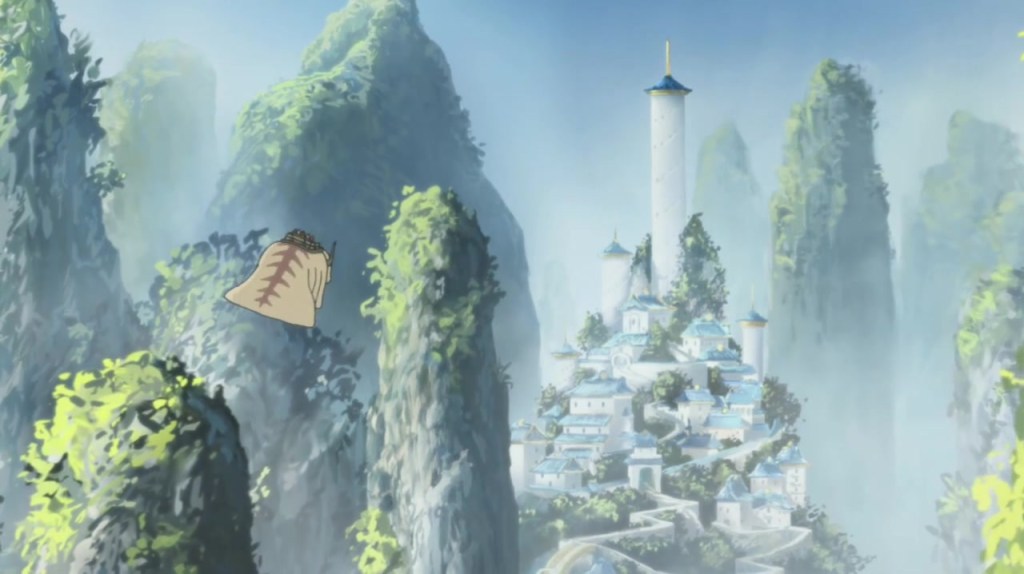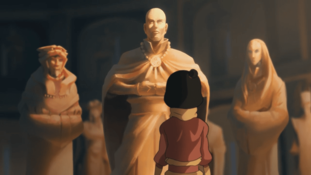 Jinora looks up at Aang’s statue, intrigued, but she suddenly senses something behind and whooshes around in a Fire Emblem-style transition, but we don’t see what was behind her.