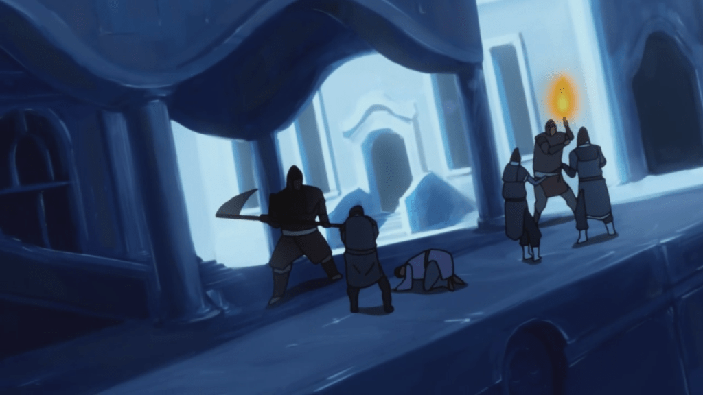 Anyway, Tonraq and his platoon run them out of the tribe and into an ancient forest belonging to the spirits. They captured the barbarians, but destroyed the forest in the process. This caused the spirits to become dark and nearly destroy the tribe if not for the timely intervention of Unalaq. Tonraq is held responsible for the tribe’s near destruction and is banished. During this flashback there’s a Traitor Shot of Unalaq which is meant to clue us in that he’s evil and he orchestrated Tonraq’s banishment.