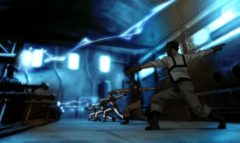 In the ensuing chaos, Mako flings an Equalist trying to re-capture his brother and drags Bolin out of the building. As they flee, they’re accosted by the Lieutenant, who carries two dangerous shock sticks. He electrocutes the ladder the brothers are climbing down, stunning them and putting them at a severe disadvantage. Like the other Equalists, the Lieutenant is incredibly acrobatic and can go toe-to-toe with the benders. He’s able to shock both brothers into submission in no time flat.