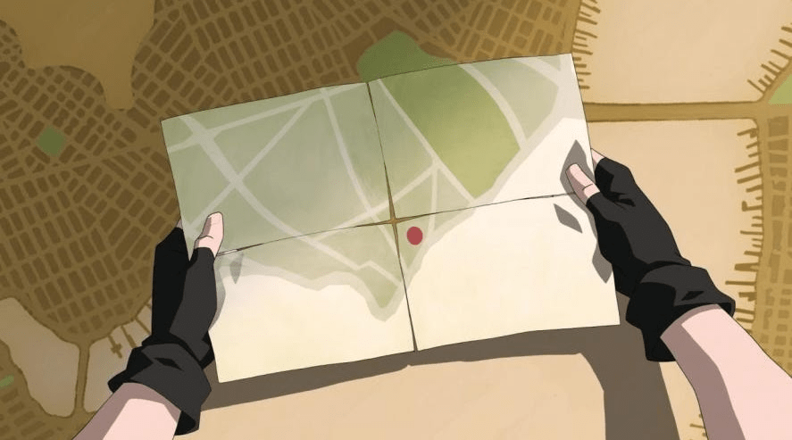They examine them on a bench, and see that there’s no location listed for the event. Mako deduces that the information’s been obfuscated to gatekeep the event, and notices a different design on the back of each leaflet. He puts together that they would collectively make a map and the leaflets they have are able to zero in on the exact location in the city that the revelation will be taking place.