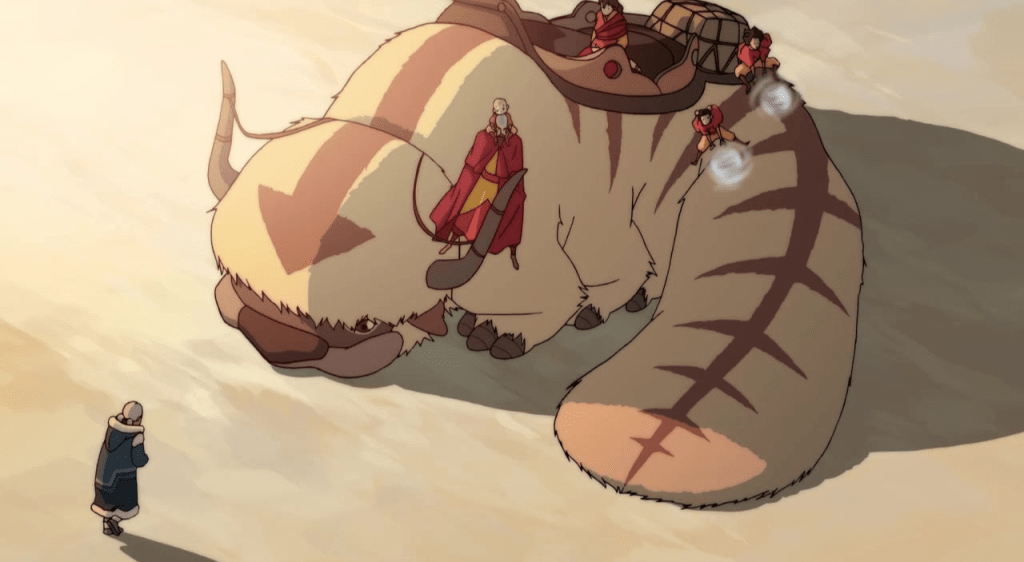 What fresh hell is this, Bryke? An honest-to-God sky bison, thought to have gone extinct with the exception of Appa? What gives? Aang, Appa, and Momo were the last living members of the Air Nation. The tragedy lied in that they were all each other had. Appa in particular was the only living part of Aang’s old life besides Bumi. It’s part of what made the arc where he went missing in Book 2 so compelling. Any viewer would naturally feel confused why this one is presented so casually and might wonder where in the hell it came from…and we don’t get an answer.