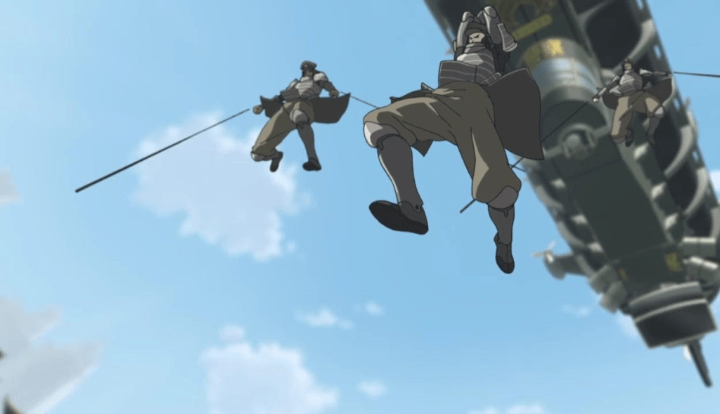 We then get our first look at the police of Republic City. Out of a giant airship comes a small squad of men decked out in metal suits travering via metal cables. Korra makes a remark telling us what they are: metalbenders.